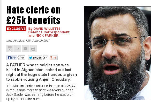 Σχ. ΚΟ: Σκεφτείτε ότι αυτόν τον άνθρωπο που έχει ως "όνειρο" να δει την μαύρη σημαία της Αλ Κάιντα να κυματίζει στην Downing Street και θέλει να επιβληθεί ο νόμος της Σαρία, δέχεται να τον φιλοξενεί η «δημοκρατική» Βρετανία, να μιλάει στο BBC και τον αφήνει ελεύθερα να διασπείρει το μίσος κατά των «απίστων». Και όχι μόνο αυτό αλλά ο «Βρετανός» Choudary λάμβανε κρατική χρηματοδότηση από το επίσημο Αγγλικό κράτος, που του χρηματοδοτούσε ακόμα και την πολυτελή οικία που διαμένει, αξίας μισού εκατομμυρίου δολαρίων, σύμφωνα με την εφημερίδα Sun!